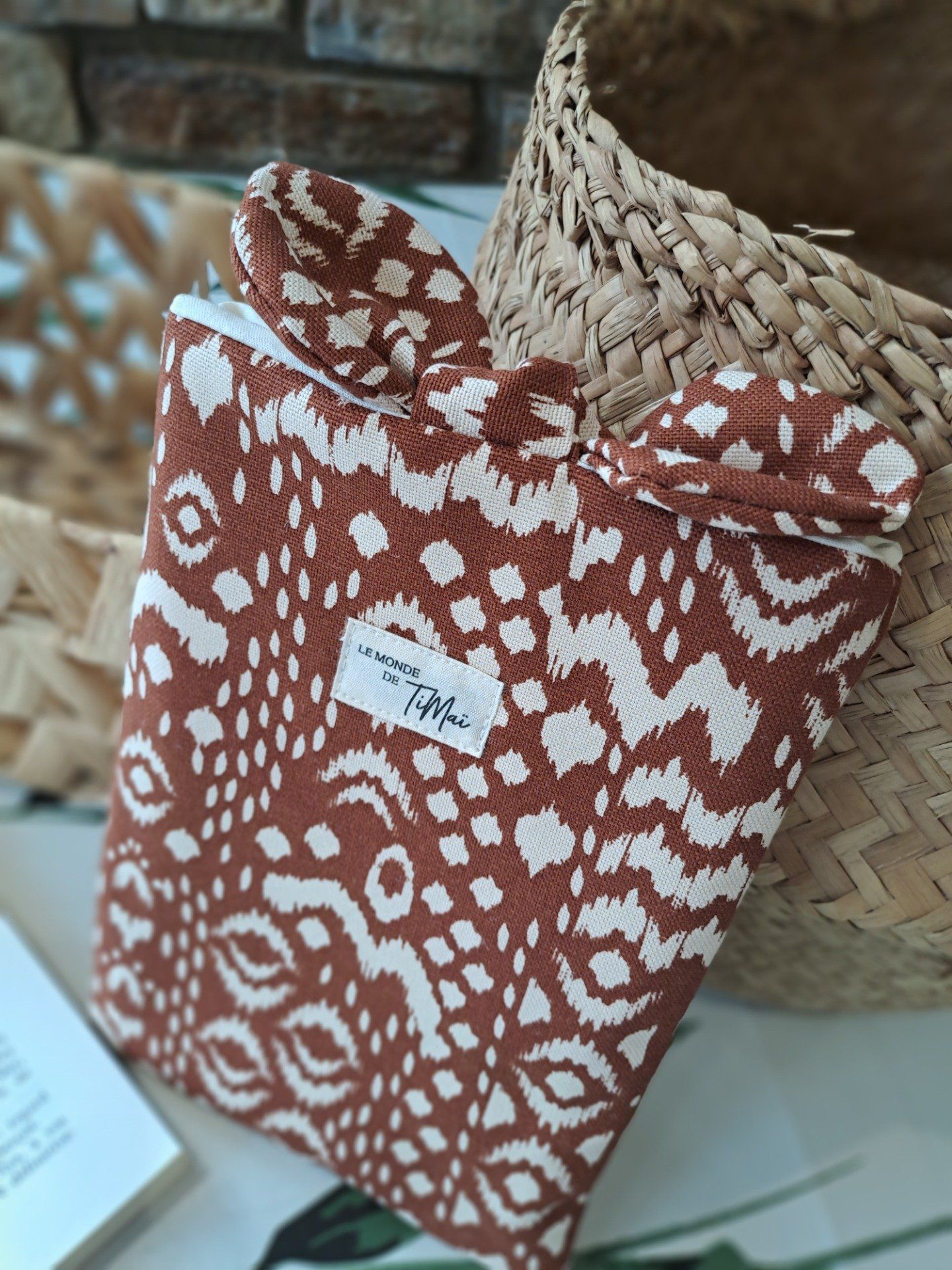 Le petit + : La fermeture est assurée par un joli petit nœud à nouer sur le dessus, qui permet de s'assurer que votre livre ne glisse pas hors de la pochette et qui apporte également un design incomparable.